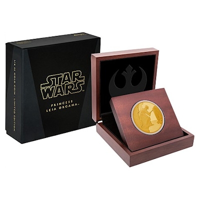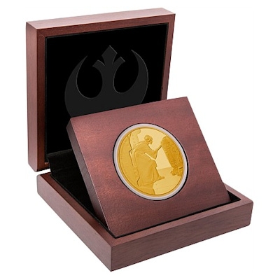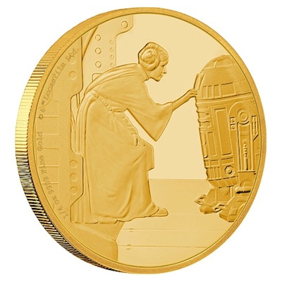 Das Motiv der Goldmünze zeigt Leia über R2-D2 gebeugt. Zusammen mit einer Nachricht soll er die Pläne des Todessterns zu Obi-Wan Kenobi bringen. Der Droide landet aber zunächst bei Luke Skywalker, der die Botschaft abhört – und so nimmt dessen Abenteuer seinen Anfang. Die Goldmünze ist ein lizensiertes Produkt der Lucasfilm Ltd, wie der Schrift am Rand zu entnehmen ist. Die Version aus 1/4 oz Gold hat einen Durchmesser von 23 Millimetern. Bei der Münze aus 1 oz Feingold beträgt er 32 Millimeter. Beide haben einen Feingehalt von 99,99 Prozent und einen geriffelten Rand. Sie sind in höchster Proof-Qualität geprägt. Der Nennwert beträgt bei der Goldmünze aus 1 oz Feingold 200 Dollars, bei der kleineren Version 25 Dollars. Er ist umseitig zusammen mit einem Porträt von Königin Elizabeth II. verzeichnet.