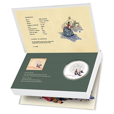 Die Verpackung ist genau der alten Weihnachtskarte nachempfunden. Klappt man sie auf, findet man neben den technischen Daten zur Münze auch ein Bild von Cinderella, die vor ihrer Kürbiskutsche in einen anmutigen Knicks sinkt. Die Silbermünze hat einen Durchmesser von 40 Millimetern und enthät 1 oz Feinsilber (Feingehalt 999/1000). Umseitig zeigt sie das Rank-Broadley-Porträt von Königin Elizabeth II und den Nennwert von 2 Neuseelanddollars. Auch das Ausgabeland ist hier verzeichnet: die Insel Niue. Es handelt sich um ein lizensiertes Disney-Produkt mit einer Auflage von 10.000 Stück.