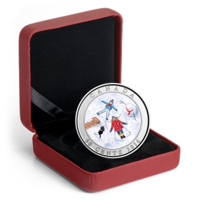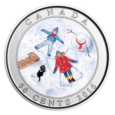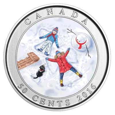 Jeder kennt aus seiner eigenen Kindheit das Vergnügen, sich in den weichen Schnee fallen zu lassen und indem man die Beine zur Seite und die Arme auf und ab bewegt, einen Schneeengel entstehen zu lassen. Die Sammlermünze zeigt diese fröhliche Wintertradition: Zwei Kinder, ein Junge und ein Mädchen, spielen im Schnee. Rechts sieht man einen Schneemann mit rotem Schal, links einen Holzrodelschlitten sowie den Familienhund. Wenn man die Münze von einer Seite zur anderen kippt, bewegen die Kinder Arme und Beine, um Schneeengel zu machen. Sogar der Hund macht mit bei dem Spiel: Er bewegt seinen Schwanz und hinterlässt dabei ebenfalls eine Spur im lockeren Schnee.