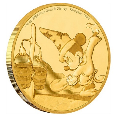 Für Fantasia wurden klassische Musikstücke mit Zeichentrickfilmen illustriert, darunter „Der Zauberlehrling“ von Paul Dukas, eine Vertonung der gleichnamigen Ballade von Johann Wolfgang v. Goethe. Micky Maus tritt darin als der ungeschickte Zauberlehrling auf, der in Abwesenheit seines Meisters einen Besen zum Leben erweckt. Eigentlich soll der Besen nur Wasser für das Bad des Meisters holen, doch stattdessen schöpft er immer weiter und weiter. Auf dem Motiv der Goldmünze ist Micky mit einem sternengeschmückten Zauberhut zu sehen. Im Vergleich zu den vorangegangenen Ausgaben sieht man, dass das Aussehen der Maus überarbeitet wurde. Das Gesicht ist jetzt menschenähnlicher und ausdrucksstärker. Auch der Besen mit seinen zwei Wassereimern ist in das Motiv integriert. Der Film feierte 1940 Premiere, wie der Aufschrift oben am Rand zu entnehmen ist.