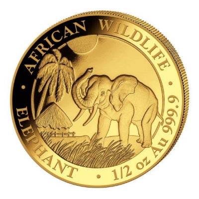 Die Goldmünze African Wildlife Elephant aus Somalia gibt es seit 2004, zuerst nur als Sammlermünze, später auch in größeren Stückzahlen und in Stempelglanz-Prägung. Seit letztem Jahr wird die Anlagemünze in der Reinheit von 99,99 Prozent ausgegeben. Das Elefantenmotiov wechselt mit jedem Ausgabejahr. Die African Wildlife Elephant 2017 zeigt einen Ausgewachsenen Elefanten von der Seite. Im Vordergrund wiegen sich Savannengräser im Wind, im Hintergrund sind eine Hütte und eine Palme zu erkennen.