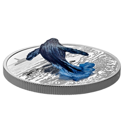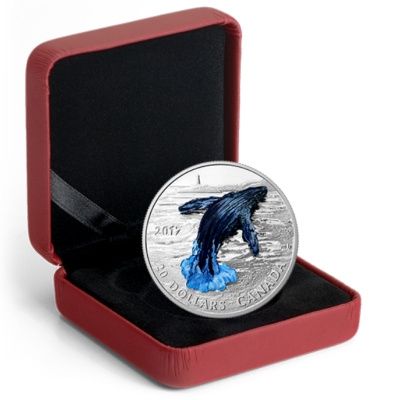 3d-buckelwal-1-oz-silber-koloriert-etuiDie Silbermünze hat einen Durchmesser von 38 Millimetern und enthält 1 oz Feinsilber. Der Feingehalt liegt bei 99,99 Prozent. Der Münzrand ist geriffelt. Unter dem Wal ist der Nennwert von 20 CAD verzeichnet. Umseitig ist das Susanna-Blunt-Porträt von Königin Elizabeth II. abgebildet. Die Sammlerstücke werden im Etui und zusammen mit einem nummerierten Echtheitszertifikat ausgegeben. Die Auflage ist auf 7.500 Stück limitiert.