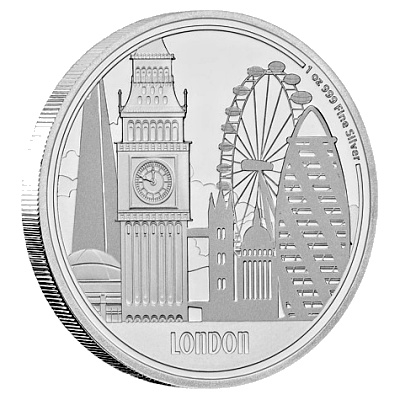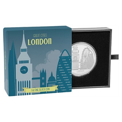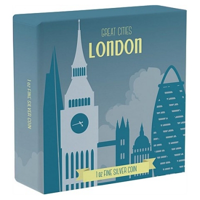Die Silbermünze zeigt verschiedene markante Gebäude aus der Londoner Skyline. Im Vordergrund steht Big Ben, das Wahrzeichen der Stadt, dahinter ist die Tower Bridge zu erkennen. Aber auch Sehenswertes aus dem modernen London wie das Riesenrad London Eye sind in das Bild integriert. Das in höchster Proof-Qualität geprägte Sammlerstück enthält 1 oz Feinsilber und hat einen Feingehalt von 999/1000. der Durchmesser liegt bei 40 Millimetern. Die Wertseite zeigt ein Porträt von Königin Elizabeth II., den Nennwert von zwei Dollars, das Ausgabeland Niue und das Ausgabejahr 2017. Der Münzrand ist geriffelt. Das Sammlerstück wird mit nummeriertem Echtheitszertifikat und verpackt in ein Schiebeetui ausgeliefert, auf dem außen noch einmal das Motiv zu sehen ist. Die Auflage ist streng limitiert auf 3.000 Stück.