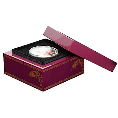 Silberne Pfingstrosen-Blüten machen das Motiv der in höchster Proof-Qualität geprägten Sammlermünze komplett. Der Durchmesser liegt bei 40 Millimetern, der Rand ist geriffelt. Der Feingehalt von 999/1000 ist unterhalb des Bildes verzeichnet. Umseitig findet man das Rank-Broadley-Porträt von Königin Elizabeth II, darüber den Nennwert von 2 Dollars und das Ausgabeland Niue. Ausgeliefert werden die Münzen aus 1 oz Feinsilber in einem schön gestalteten, weinrot lackierten Kästchen und einer passenden Umverpackung.