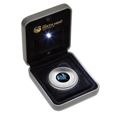 australian-opal-year-of-the-rooster-1-oz-silber-shipperDie Silbermünze hat einen Feingehalt von 99,99 Prozent und einen Durchmesser von 36,60 Millimetern bei einer maximalen Dicke von 4,5 Millimetern. Der Rand ist geriffelt. Umseitig zeigt das Sammlerstück, das als gesetzliches Zahlungsmittel in Australien gilt, ein  Porträt der Queen, darunter den Nennwert von einem Dollar. Die Sammlermünzen werden in höchster Proof-Qualität aus 1 oz Feinsilber geprägt. Sie werden in einem Etui mit Beleuchtung ausgeliefert: So kommen die schillernden Farben des Opals eindrucksvoll zur Geltung, sobald man den Deckel aufklappt. Auch die Umverpackung ist passend zum Thema schön gestaltet.