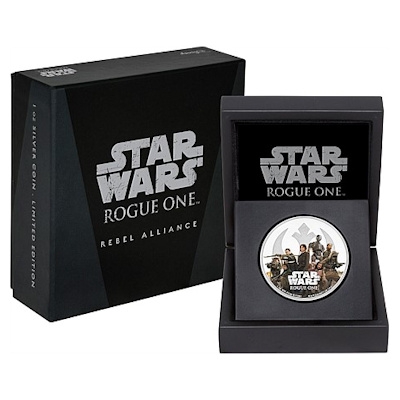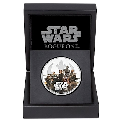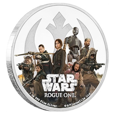 Der Film erzählt die Vorgeschichte des ersten Teils der Saga und berichtet, wie die Rebellen in den Besitz der Baupläne des Todessterns gelangten. Dafür tritt eine recht bunt zusammengewürfelte Truppe gegen das übermächtige Imperium an. Protagonistin ist Jyn Erso, gespielt von Felicity Jones. Ihr Vater wurde vom Imperium dazu gezwungen, den Todesstern zu konstruieren. Auf dem Motiv der Silbermünze ist sie in der Mitte zu sehen. Links von ihr steht der blinde Krieger Chirrut Imwe, vor ihm kniet Rebellenoffizier Cassian Andor. Rechts von Jyn steht im Hintergrund der Droide K-2SO, vor ihm Pilot Bodhi Rook und davor der Außerirdische Pao. Vorne macht Baze Malbus die Truppe komplett. Im Hintergrund ist das Rebellen-Logo zu sehen.