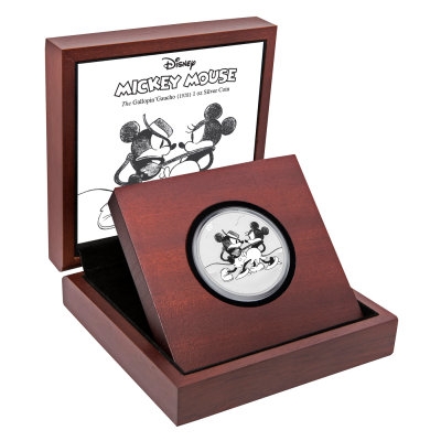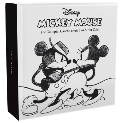 1928 hatten Micky und Minnie Maus ihr erstes Date, nämlich in dem Zeichentrickfilm The Gallopin‘ Gaucho. Diesem ist die neueste Ausgabe der Silbermünzen-Serie „Mickey Through the Ages“ der New Zealand Mint gewidmet. Sie zeigt die beiden Stars beim Tango. Wie die Vorgänger enthält auch dieses Sammlerstück 1 oz Feinsilber und wird in einem stilvollen Holzetui ausgeliefert. Die Auflage ist auf 10.000 Exemplare weltweit limitiert.