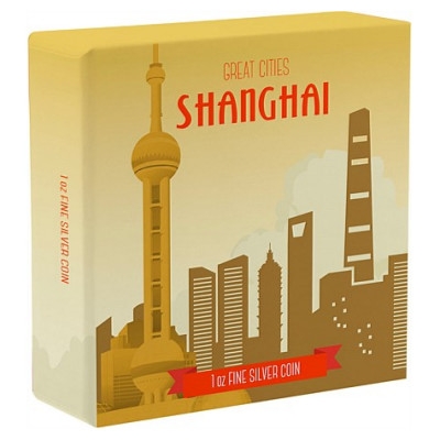 great-cities-shanghai-1-oz-silber-verpackungDie in höchster Proof-Qualität geprägte Silbermünze setzt das Stadtpanorama detailreich in Szene. Das Sammlerstück enthält 1 oz Feinsilber und hat einen Feingehalt von 999/1000. Der Durchmesser beträgt 40 Millimeter. Der Münzrand ist geriffelt. Die Wertseite zeigt ein Porträt von Königin Elizabeth II., den Nennwert von zwei Dollars, das Ausgabeland Niue und das Ausgabejahr 2017. Die Münze wird mit nummeriertem Echtheitszertifikat ausgeliefert. Die Verpackung zeigt noch einmal die beeindruckende Skyline von Shanghai.