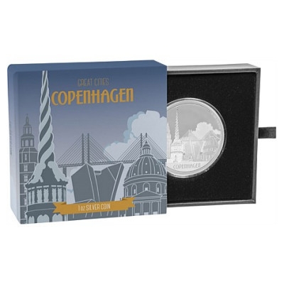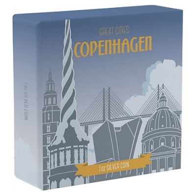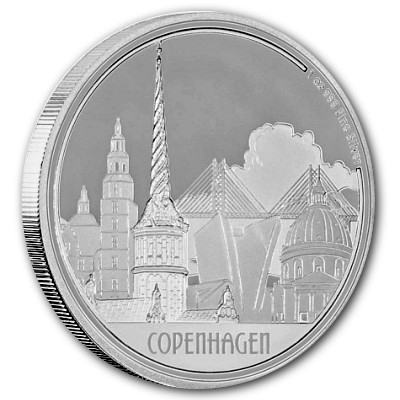 Die Silbermünze, die in höchster Proof-Qualität geprägt ist, gibt einen Eindruck von der Kombination aus historischen Bauten und moderner Architektur, die den Charme der dänischen Hauptstadt ausmacht. Sie enthält 1 oz Feinsilber bei einem Feingehalt von 999/1000. Der Durchmesser beträgt 40 Millimeter. Der Münzrand ist geriffelt. Der Nennwert beträgt zwei Dollar, Ausgabeland ist Niue. Auf der Wertseite findet man das Portät von Königin Elizabeth II. Das Sammlerstück wird mit nummeriertem Echtheitszertifikat und verpackt in ein Schiebeetui ausgegeben. Die Auflage ist streng limitiert auf nur 3.000 Stück.