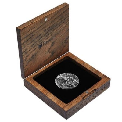 Der Detailreichtum des Motivs kommt durch die Prägung in High Relief noch besser zur Geltung. Angesichts des freizügigen Outfits der Göttin kann man sich gut vorstellen, dass sie, wie der Gott Loki ihr nach einer anderen Sage auf einem Fest vorwirft, mit allen Anwesenden Liebeschaften hatte. Das Antik-Finish unterstreicht den kriegerischen Aspekt ihres Auftretens. Die Silbermünze aus 2 oz Feinsilber hat einen Durchmesser von 40,60 Millimetern und eine Dicke von 6 Millimetern. Der Münzrand ist glatt. Der Feingehalt liegt bei 99,99 Prozent. Die Wertseite zeigt das Porträt von Königin Elizabeth II., den Nennwert von 2 Dollars und das Ausgabeland Tuvalu. Verpackt ist das Sammlerstück in ein Holzetui mit graviertem Deckel, das gut zum historischen Look der Münze passt. Ein nummeriertes Echtheitszertifikat ist ebenfalls mit dabei.