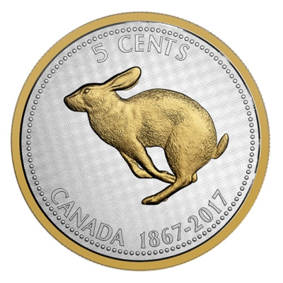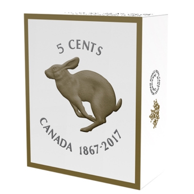 Bei einem Durchmesser von 65,25 Millimetern hat das Motiv hier deutlich mehr Platz, sich zu entfalten, als auf dem originalen 5-Cent-Stück. Der Nennwert bleibt jedoch gleich. Die Jahreszahlen 1867 – 2017 weisen auf das aktuelle Jubiläum hin. Kaninchen und Rand sind vergoldet. Das gilt auch für Krone und Gewand von Elizabeth II., die umseitig abgebildet ist. Auch hier war das Originaldesign von 1967 Vorbild; die Münze zeigt also eine recht junge Queen nach dem Porträt von Arnold Machin. Das Sammlerstück enthält 5 oz Feinsilber und hat einen Feingehalt von 99,99 Prozent. Es ist verpackt in ein Etui und einen Karton, auf dem noch einmal das Kaninchenmotiv zu sehen ist. Ein nummeriertes Echtheitszertifikat gehört dazu. Die Auflage von 2.150 Stück verweist noch einmal auf das Jubiläumsjahr.