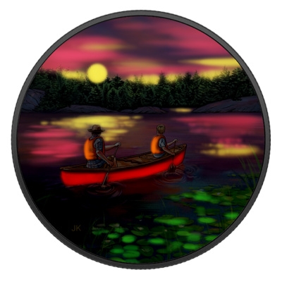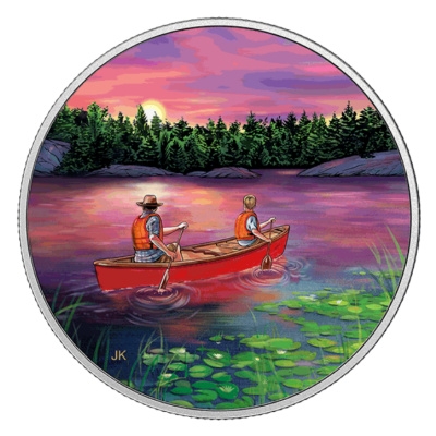 Mit der geschickt eingesetzten Glow-in-the-Dark-Technologie gelingt es dem Künstler, eine kleine Geschichte zu erzählen: Die abendliche Paddeltour, die beinah identische Haltung von Vater und Sohn, die auf die Weitergabe einer Tradition von einer Generation an die nächste hindeutet -all das beflügelt die Fantasie des Betrachters. Am besten legt man die in höchster Proof-Qualität geprägte Silbermünze zuerst 30 bis 60 Sekunden unter eine Lichtquelle, bevor man sie bei Dunkelheit betrachtet. Die Münze hat einen Durchmesser von 36,07 Millimetern und ein Gewicht von 23,17 Gramm. Der Feingehalt liegt bei 99,99 Prozent. Die Wertseite präsentiert neben dem Nennwert von 15 CAD ein Porträt von Königin Elizabeth II. Der Münzrand ist geriffelt. Die Auflage ist auf 15.000 Exemplare limitiert.