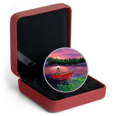 Kanutouren gehören zu den beliebtesten Freizeitaktivitäten der Kanadier – kein Wunder, bei einem Land voller Flüsse und Seen, die darauf warten, entdeckt zu werden! In der Silbermünzen-Serie „Great Canadian Outdoors“ brechen auf der Frühlingsausgabe ein Vater und sein Sohn zu einer Tour in den Sonnenuntergang auf. Ein in höchster Proof-Qualität geprägtes Motiv, das mit leuchtenden Farbapplikationen versehen und zusätzlich mit Leuchteffekten verdelt ist, macht diese Münze zu einem eindrucksvollen Sammlerstück.