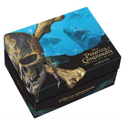 Unten schließt der Titel „Pirates of the Caribbean Dead Men Tell No Tales“ das mit Farbapplikationen gestaltete Motiv ab. Die in höchster Proof-Qualität geprägte Silbermünze hat einen Durchmesser von 40 Millimetern und einen geriffelten Rand. Sie enthält 1 oz Feinsilber (Feingehalt 999/1000). Auf der Wertseite findet man das Porträt von Elizabeth II. von Ian Rank-Broadley sowie den Nennwert von 2 Dollars und das Ausgabeland Niue. Die Auflage ist auf 10.000 Exemplare limitiert. Sie werden in einem Holzetui ausgegeben, das wie eine alte Schatztruhe gestaltet ist. Ein nummeriertes Echtheitszertifikat und ein Karton im Seriendesign gehören auch dazu.