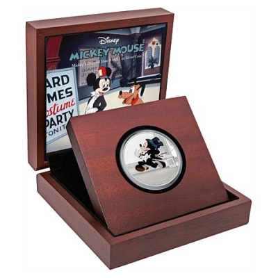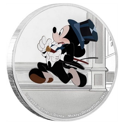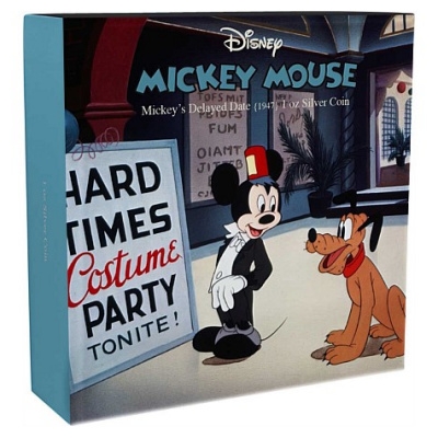 Das Motiv der Silbermünze zeigt Micky Maus in Frack und Zylinder, wie er zu seiner Verabredung mit Minnie spurtet. Die hatte er über seinem Schläfchen im Sessel nämlich ganz vergessen. So fein hergerichtet, wie er hier zu sehen ist, wird er allerdings nicht ankommen. Der Verkehr und ein Sturz in eine Mülltonne sorgen dafür, dass er am Ende genau richtig angezogen ist für die Kostümparty unter dem Motto „Hard Times“, auf die er mit Minnie gehen soll. Seine Aufmachung am Ende des Kurzfims ist auf dem Shipper zu sehen. „Mickey’s Delayed Date“ ist übrigens einer letzten Filme, für die Walt Disney Micky seine Stimme lieh.