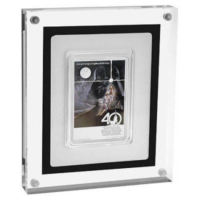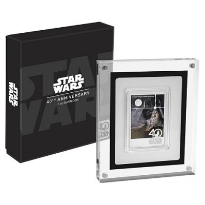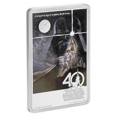 40-jahre-star-wars-1-oz-silber-koloriertDer 25. Mai 1977 ist der Geburtstag eines Mythos: An diesem Tag vor 40 Jahren startete in den USA der Kinofilm Star Wars. Er wurde nicht nur zum bis dahin erfolgreichsten Film überhaupt, sondern auch zur Keimzelle einer ganzen Science-Fiction-Welt mit Prequels und Sequels, Fanartikeln, Büchern und Computerspielen. Die New Zealand Mint, die bereits die Münzserien Star Wars Classic, Episode VII und Star Wars Ships im Programm hat, ehrt das Weltraummärchen zum 40. Jubiläum mit einer Silbermünze, die ein Originalplakat zeigt.40-jahre-star-wars-1-oz-silber-koloriert-etui„A long time ago in a galaxy far, far away …“ Mit diesen Worten beginnt der Film „Krieg der Sterne„. Sie sind oben auf dem Plakat zu lesen. Das Bild wird von der großen Darstellung des Filmbösewichts Darth Vader dominiert. Neben seiner ominösen Maske steht der Todesstern wie ein Mond am Himmel. Im Vordergrund sind die Guten, Luke Skywalker und Prinzessin Leia, unschwer an ihrer strahlend weißen Kleidung und der Heldenpose zu erkennen. Im Hintegrund entdeckt man auch noch die Sympathieträger des Films, die Roboter C-3PO und R2-D2. Der Kampf Gut gegen Böse, mutige Ritter und eine schöne Prinzessin – diese märchenhaften Elemente treffen in „Star Wars“ auf Special Effects, die zu ihrer Zeit Maßstäbe setzten. Mit dieser Kombination begeisterte der erste Teil der Weltraum-Saga das Publikum und gewann sechs Oscars. Noch heute gehört Darth Vader zu den bekanntesten Filmschurken,  Han Solo zu den beliebtesten Helden.