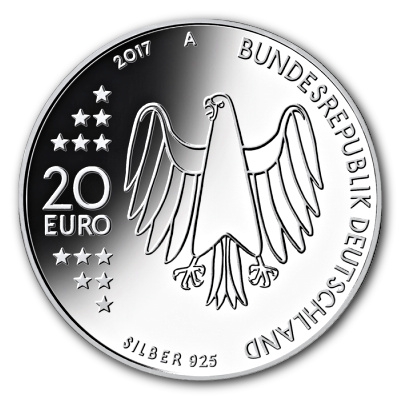 Das Bild, das wir von Luther haben, prägte der Maler Lucas Cranach der Ältere. Auch der Künstler Patrick Niesel, der das Motiv gestaltet hat, nutzte ein Luther-Porträt Cranachs als Vorlage. Die moderne Zeichnung fängt das Typische des Originals ein und übersetzt es doch in eine zeitgemäße Ästhetik. Luthers linke Gesichtshälfte ist von einem Textauszug aus den 95 Thesen überdeckt. Am Rand entlang findet man die Aufschrift „500 Jahre Reformation„. Der Bundesadler auf der Wertseite setzt die Darstellung im Stil einer Zeichnung fort. Links ist der Nennwert von 20 Euro verzeichnet, umgeben von den 12 Europasternen. Die Silbermünze hat einen Durchmesser von 32,50 Millimetern einen Feingehalt von 925/1000. Sie wird in einer Stempelglanz-Version und auch in Spiegelglanz-Prägung ausgegeben.