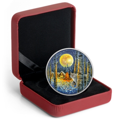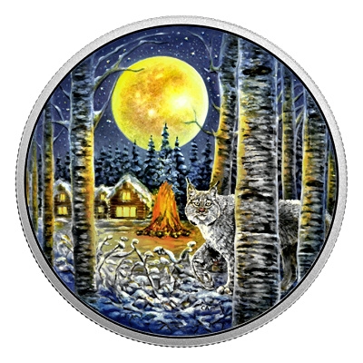 animals-in-the-moonlight-lynx-2-oz-silber-koloriertDer Vollmond leuchtet am Himmel. Auf einer Lichtung mitten in Kanadas weiten Wäldern steht eine einsame Blockhütte. Die erleuchteten Fenster und ein großes Lagerfeuer sind ein Zeichen dafür, dass hier Menschen zu finden sind. Und sie haben einen neugierigen Beobachter aus dem winterlichen Wald angelockt: einen Luchs. Er ist der Hauptdarsteller auf der neuen Ausgabe der Silbermünzen-Serie „Animals in the Moonlight“. Das Sammlerstück aus 2 oz Feinsilber ist übrigens nicht nur liebevoll koloriert, sondern leuchtet auch noch im Dunkeln.
