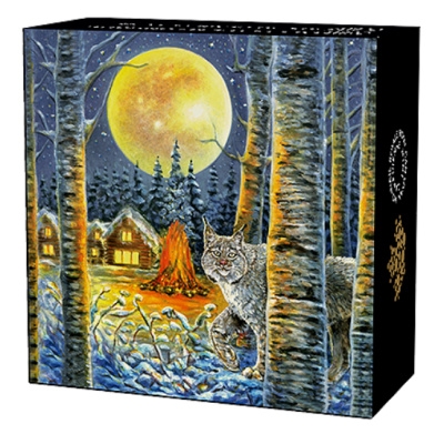 animals-in-the-moonlight-lynx-2-oz-silber-koloriert-etuiDer Luchs hat sich dem Betrachter der Silbermünze zugewandt, als hätte er bemerkt, dass sich durch den Winterwald jemand dem Blockhaus nähert. Das Gesicht erinnert an eine Hauskatze, an den langen Ohrpinseln, den großen Pfoten und natürlich auch an der Größe ist der scheue Waldbewohner aber unschwer zu identifizieren. Der Stummelschwanz, ein weiteres typisches Merkmal des Luchses, bleibt hinter den Baumstämmen verborgen. Auf der anderen Seite der Lichtung ragen hohe Nadelbäume in den Nachhimmel. Über ihnen steht ein riesiger Vollmond am Himmel.