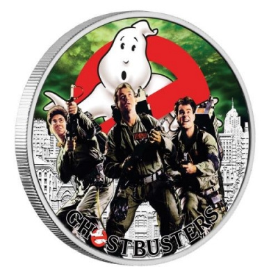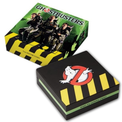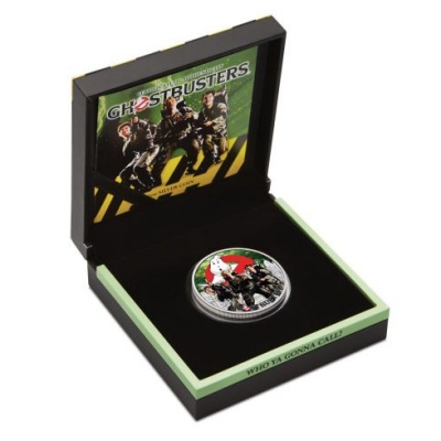 Die in höchster Proof-Qualität geprägte Silbermünze zeigt die mit Farbapplikationen gestalteten Protagonisten Dr. Egon Spengler (Harold Ramis), Dr. Peter Venkman (Bill Murray) und Dr. Raymond Stantz (Dan Aykroyd) im Einsatz. Winston Zeddemore (Ernie Hudson), der das Team im Lauf des Films ergänzt, ist nicht dabei. Im Hintergrund ist die silberne Skyline von New York zu erkennen, hinter der das ebenfalls kolorierte „No Ghost“-Logo aufragt. Das Sammlerstück hat einen Durchmesser von 40,60 Millimetern und enthält 1 oz Feinsilber (Feingehalt 99,99 Prozent). Der Münzrand ist geriffelt. Auf der Wertseite findet man das Porträt von Königin Elizabeth II., den Nennwert von 1 Dollar und das Ausgabeland Tuvalu. Bei diesem lizenzierten Produkt stimmt auch die Verpackung: ein Etui mit Logo und ein Shipper, der das Münzmotiv aufgreift. Ein nummeriertes Echtheitszertifikat gehört dazu.