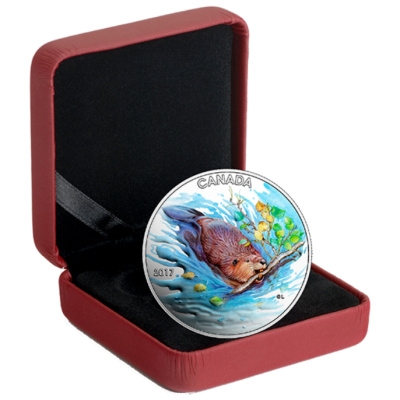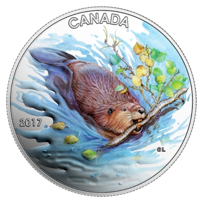 Wer beim Wandern oder mit dem Kanu an bzw. auf Kanadas Flüssen und Seen unterwegs ist, erspäht mit etwas Glück vielleicht auch einmal eines der rundlichen Tiere mit dem typischen flachen Schwanz im Wasser. Der Biber auf dem Motiv der Silbermünze transportiert gerade einen Espenzweig mit frischen grünen Blättern zu seiner Burg. Ein paar Blättchen driften im sich kräuselnden Wasser davon, während er schwimmt. Die Silbermünze mit einem Durchmesser von 34 Millimetern enthält 1/2 oz Feinsilber (Feingehalt 99,99 Prozent). Der Münzrand ist geriffelt. Die Wertseite zeigt das Susanna-Blunt-Porträt von Königin Elizabeth II. Das Sammlerstück hat einen Nennwert von 10 CAD. Es wird gekapselt, im Etui und mit nummeriertem Echtheitszertifikat ausgegeben.