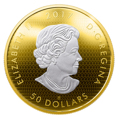 canada-whispering-maple-leaves-3-oz-silber-vergoldet-wertseiteAuch der geriffelte Münzrand und das Obervers sind vergoldet. Hier zeigt sich lediglich das Porträt von Königin Elizabeth II. in Silber. Der Hintergrund besteht aus kleinen Ahornblättern. Die Münze hat einen Durchmesser von 55 Millimetern. Sie enthält 3 oz Feinsilber und hat einen Feingehalt von 99,99 Prozent. Der Nennwert beträgt 50 CAD. Das Sammlerstück wird gekapselt, im Etui und mit nummeriertem Echtheitszertifikat ausgegeben. Bei der niedrigen Auflage von nur 3.500 Exemplaren sollten Fans des Maple Leafs nicht zu lange zögern, sich diese exquisite Silbermünze in Proof-Qualität zu sichern.