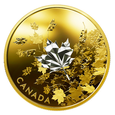 canada-whispering-maple-leaves-3-oz-silber-vergoldet-etuiDas Ahornblatt als Nationalsymbol spielt auf den Münzen der Royal Canadian Mint immer wieder eine prominente Rolle; es ziert auch die bekannte Anlagemünze Maple Leaf. Diese vergoldete Silbermünze schafft es dennoch, dem beliebten Motiv ein frisches Erscheinungsbild zu geben. Das Motiv zeigt einen ganzen Strauß Ahornblätter, die wie von einem Windstoß getroffen durcheinander wirbeln. Jedes der Blätter ist aus einzelnen geometerischen Formen zusammengesetzt – eine Technik, die Münzsammler schon bei der Serie Geometry in Art bewundern konnten. Die Münze ist großflächig vergoldet. Umso mehr sticht das große Ahornblatt in der Mitte heraus, das in Silber belassen wurde.