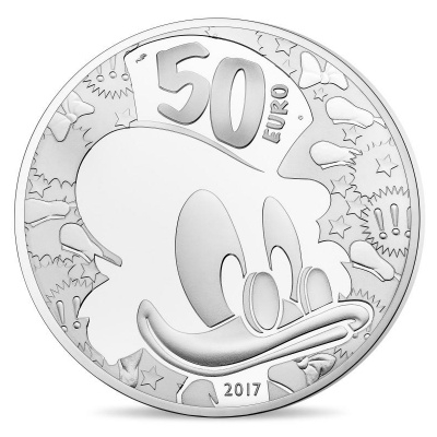 Die Wertseite zeigt analog dazu ebenfalls die Umrisse von Dagoberts Kopf, umgeben von einem Hintergrund mit Comicsymbolen, Sternen, Donalds Mütze und Daisys Schleife. Der Nennwert von 50 Euro ist im Zylinder zu finden. Auf dem Hals ist das Prägejahr 2017 vermerkt. Die in höchster Proof-Qualität geprägte Silbermünze hat einen Durchmesser von 50 Millimetern und enthält 5 oz Feinsilber (Feingehalt: 950/1000). Der Münzrand ist glatt. Die Sammlerstücke wurden gekapselt, im Etui und mit nummeriertem Echtheitszertifikat ausgegeben. Die Auflage ist streng limitiert auf nur 500 Stück, die bei der Prägeanstalt bereits ausverkauft sind.