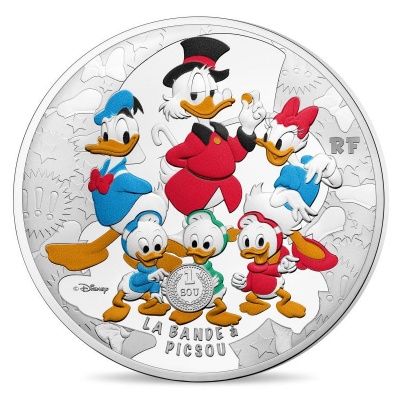 Dagobert Duck – auf englisch Scrooge McDuck – hatte seinen ersten Auftritt als Donalds reicher Onkel im Jahr 1947. Sein Erfinder Carl Barks gestaltete ihn erst als unleidlichen Geizhals nach dem Vorbild der Dickens-Figur Ebenezer Scrooge, der er auch seinen Vornamen verdankte. Im Lauf der Zeit bekam die reichste Ente der Welt aber einen sympathischeren Charakter. 1967 war Dagobert Duck zum ersten Mal in einem Kurzfilm zu sehen. In der Serie Ducktales spielte er schließlich eine der Hauptrollen. Sein typisches Outfit besteht aus Gehrock, Zylinder, Gehstock und einem Zwicker auf dem Schnabel. So ist er auch auf der Silbermünze abgebildet, im Kreise der Familie: Neben ihm stehen Donald und Daisy, vorn sind Tick, Trick und Track zu sehen. Ein Schattenriss von Dagoberts Kopf bildet den Hintergrund, unten ist der französische Name der Serie aufgeprägt, „La Bande à Picsou“.
