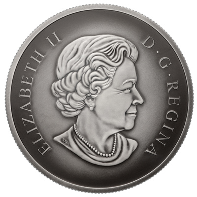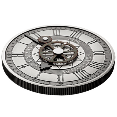 Der 92 Meter hohe Peace Tower ragt aus dem im neugotischen Stil erbauten Centre Block der der kanadischen Parlamentsgebäude heraus. Gemeinsam traten die Uhr und das Glockenspiel mit 53 Glocken vor 90 Jahren den Dienst an. Aus jeder Richtung ist eines der vier Ziffernblätter deutlich zu sehen. Römische Zahlen markieren die Stunden. Dabei fällt auf, dass die Vier als „IIII“ statt wie zum Beispiel bei Big Ben als „IV“ dargestellt ist. Auch über dieses Detail hinaus gibt das Motiv der Silbermünze das reale Vorbild genau wieder. Lediglich der Rahmen innerhalb des Ziffernkreises ist etwas breiter, um Platz für die Nennwertangabe von 50 CAD, das Prägejahr und das Wort Canada zu schaffen.