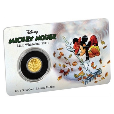 In „The Little Whirlwind“ will Micky eigentlich Minnies Hof aufräumen, um sich ein Stück von ihrem frisch gebackenen Kuchen zu verdienen. Er wird jedoch von einem Baby-Tornado gestört. Als er den kleinen Wirbelwind verjagt, ruft er unabsichtlich Mama Sturm auf den Plan, die die ganze Umgebung verwüstet. Die Mini-Goldmünze zeigt seine Begegnung mit dem kleinen Sturm. Sie hat einen Durchmesser von 11 Millimetern. Der Feingehalt von 99,99 Prozent ist zusammen mit dem Gewicht von 0,5 Gramm unten am Rand verzeichnet. Der Münzrand ist geriffelt. Die Wertseite zeigt den Nennwert von 2,5 Dollars und ein Porträt von Königin Elizabeth II. Ausgabeland ist die Insel Niue. Die Auflage ist auf 5.000 Stück begrenzt. Das nummerierte Echtheitszertifikat ist auf der Rückseite der Karte zu finden.