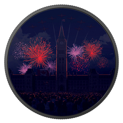 celebrating-canada-2017-2-oz-silber-koloriert-leuchteffektEin Feuerwerk für Numismatik-Fans zündet die Royal Canadian Mint zu Kanadas 150. Geburtstag. Die Jubiläumsausgaben umfassen kolorierte Silbermünzen, Sonderausgaben mit dem Maple Leaf, vergoldete Sammlerstücke nach dem Vorbild früherer Kursmünzen und vieles mehr. Ein Neuzugang ist diese eindrucksvolle Münze aus 2 oz Feinsilber mit Glow-in-the-Dark-Effekt und Farbapplikationen. Das Motiv zeigt die Feier zum Canada Day, dem Nationalfeiertag, auf dem Parliament Hill in der Hauptstadt Ottawa. Bei der Prägeanstalt ist das Sammlerstück bereits ausverkauft.