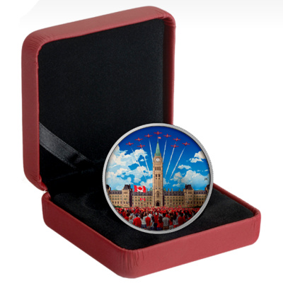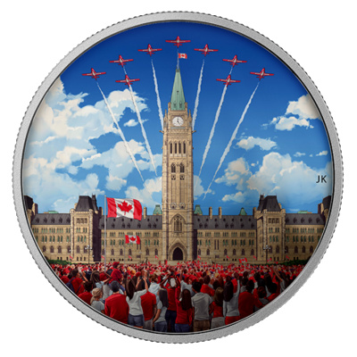 celebrating-canada-2017-2-oz-silber-koloriert-leuchteffekt-2Für alle, die am 1. Juli 2017 nicht dabei waren, um Kanadas 150. Geburtstag in der Hauptstadt mitzufeiern, lässt diese Silbermünze das Ereignis lebendig werden. Den Mittelpunkt des Motivs bildet der Peace Tower, der hoch aus den Parlamentsgebäuden aufragt. Auf seiner Spitze und an zwei Masten flattert die Maple Leaf Flag im Wind. Im Vordergrund hat sich eine Menschenmenge versammelt, Frauen, Männer und Kinder in weißen und roten Oberteilen, von denen viele kleine Fahnen schwenken. Die Blicke der Menschen sind zum Himmel gerichtet. Dort malen die Snowbirds, die Kunstflugstaffel der Royal Canadian Air Force, weiße Kondensstreifen auf das strahlende Blau, während sie direkt über den Parlamentsgebäuden ihre Flugkünste demonstrieren.