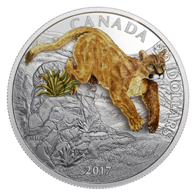 Wenn der Puma zum Sprung ansetzt, ist für seine Beute meist alles zu spät: Kanadas größte Katze ist eine Meisterin des Überraschungsangriffs. Wie es aussieht, wenn diese kraftvolle Jägerin zuschlägt, zeigt die Silbermünze „Leaping Cougar“. Wie schon bei der Ausgabe zum Buckelwal ist das Tier aus thermoplastischem Kunststoff gestaltet, der nur an einem Ende mit der Oberfläche verbunden ist. Die Auflage wurde im Vergleich zum Vorgänger auf 6.000 Exemplare gesenkt.