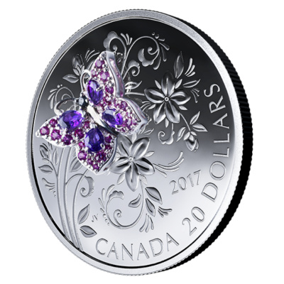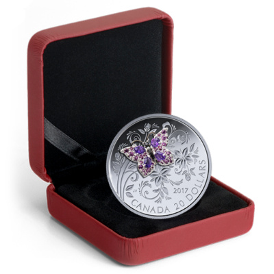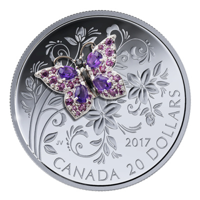 canada-bejuweled-butterfly-1-oz-silber-seiteWie fliegende Juwelen sind Schmetterlinge der Schmuck jedes sommerlichen Gartens. Von dieser Metapher hat sich die Royal Canadian Mint zu einer besonderen Silbermünze inspirieren lassen: Der Schmetterling auf diesem Sammlerstück aus 1 oz Feinsilber besteht tatsächlich aus Edelsteinen und Halbedelsteinen. Ein liebevoll gestaltetes Blütenmotiv und spiegelnde Proof-Prägung bringen das Insekt zum Strahlen. Die Auflage ist auf 4.000 Stück limitiert.
