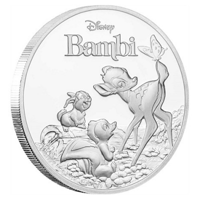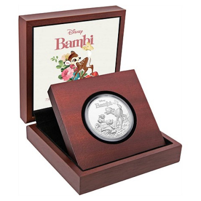 75-jahre-bambi-disney-1-oz-silberGenerationen von Kindern sind mit der Geschichte von Bambi, dem kleinen Kitz, das zum stolzen König des Waldes wird, aufgewachsen. Vor 75 Jahren, am 8. August 1942, kam der Disney-Klassiker ins Kino. Zum „Geburtstag“ gibt es jetzt von der New Zealand Mint eine liebevoll gestaltete Silbermünze, die eine idyllische Szene mit Bambi, Klopfer und Blume zeigt. Die Auflage dieses bezaubernden Sammlerstücks aus 1 oz Feinsilber ist auf 10.000 Exemplare limitiert.