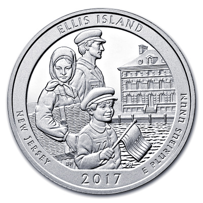 america-the-beautiful-quarters-new-jersey-ellis-island-5-oz-silber-wertseiteDas Motiv der Silbermünze zeigt Vater, Mutter und einen Jungen vor dem Hospital auf Ellis Island. Während die Mutter besorgt aussieht, wirkt der Sohn fröhlich und aufgregt. In der Hand hat er bereits eine kleine US-Flagge. Auf dem Rand ist der Staat New Jersey zu finden, unten das Prägejahr und rechts das Motto „E Pluribus Unum“. Umseitig zeigt die Silbermünze ein Porträt von George Washington, dem ersten Präsidenten der Vereinigten Staaten von Amerika, daneben die Worte „Liberty“ und „In God We Trust“. Unten ist der Nennwert – ein „Quarter Dollar“ – verzeichnet. Die in Stempelglanz-Qualität geprägten Münzen enthalten 5 oz Feinsilber und haben einen Feingehalt von 999/1000.