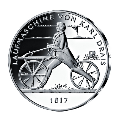 Im Jahr 1817 präsentierte Karl Freiherr von Drais eine bahnbrechende Erfindung: ein mit Muskelkraft angetriebenes Zweirad – die Draisine. Die Laufmaschine des Erfinders war der Vorläufer des Fahrrads. Zum 200. Geburtstag der Draisine hat die Bundesrepublik Deutschland jetzt eine 20-Euro-Gedenkmünze aus Sterlingsilber herausgegeben. Das Sammlerstück ist in einer Spiegelglanz- und einer Stempelglanz-Variante erhältlich.