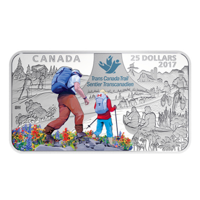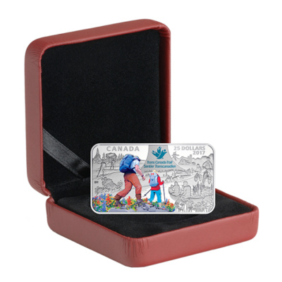 trans-canada-trail-1.5-oz-silber-koloriertDer Trans Canada Trail ist der längste Wanderweg der Welt. Er verbindet die Ost- und Westküste des Landes mit einem insgesamt 24.000 Kilometer langen Streckennetz. Am 26. August 2017 wird die Fertigstellung des Teilstücks durch Ontario gefeiert. Ein Ereignis, das auch im Zeichen des Jubiläums 150 Jahre Canada steht – und das die Royal Canadian Mint mit dieser besonderen Silbermünze feiert.