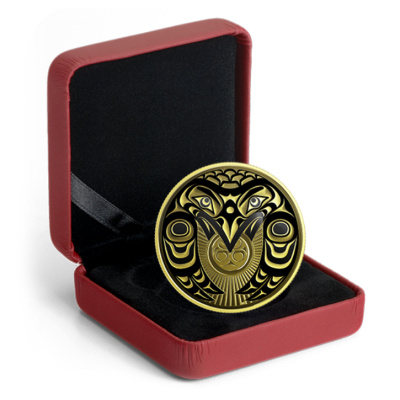 rcm-raven-brings-the-light-14-karat-gold-etuiSeit Tausenden von Jahren erzählen die Völker der nördlichen Pazifikküste – zum Beispiel die Haida – die Geschichte davon, wie der Rabe das Licht in die Welt brachte. Demnach bewahrte der Himmelsgott den Lichtball in einer kleinen Schatulle auf. Durch einen Trick konnte der Rabe ihm den Ball abnehmen und flog damit hoch in den Himmel hinauf. Dort zerbrach der Ball und schuf so die Sonne, den Mond und die Sterne. Das Motiv der Goldmünze zeigt den Raben im Besitz des Lichtballs. Angelehnt an die Formlinien-Kunst der First Nations ist der schlaue Vogel mit dunkel kolorierten Linien gezeichnet, die den leuchtenden Ball, von dem Strahlen ausgehen, durch den Kontrast noch besser zur Geltung bringen.