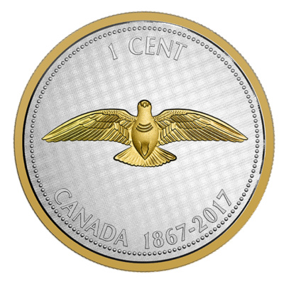 Alle Münzen der Big Coin Serie haben den ursprünglichen Nennwert behalten, sodas auch diese große Silbermünze den Nennwert von lediglich 1 Cent trägt. Darunter ist eine Felsentaube mit ausgebreiteten Flügeln zu sehen. Der Betrachter blickt von unten auf den Vogel; die einzelnen Federn sind schön zu erkennen. Zusätzlich zur Prägung in der höchsten Prägequalität Polierte Platte ist die Silbermünze teilweise vergoldet. Neben dem Vogel schimmert auch der Rand in warmem Goldglanz. Unten findet man die Jahreszahlen 1867 – 2017 als Hinweis auf das Jubiläumsjahr, das derzeit in Kanada gefeiert wird.