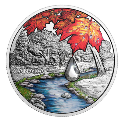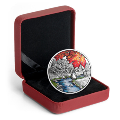rcm-jewel-of-the-rain-1-oz-silber-koloriert-kristall-etuiDer Zuckerahorn ist Kanadas Nationalsymbol. Seine Blätter waren das Vorbild für die Maple-Leaf-Flagge, sein Saft wird in den Sugar Shacks zum erstklassigen kanadischen Ahornsirup verarbeitet. Und im Herbst bezaubern seine in prächtigen Gold- und Orangetönen gefärbten Blätter. Dieses Herbstgewand des Zuckerahorns fängt die mit liebevollen Farbapplikationen gestaltete Silbermünze ein. Ein sprudelnder Bach vor dem Hintergrund des silbernen Waldes bildet den Kontrast zu den intensiv gefärbten Ahornblättern, von denen einige Regentropfen abperlen. Ein Tropfen wird dabei von einem weißen Swarovski-Kristall gebildet.