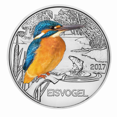 Der Eisvogel zieht mit seinem leuchtenden Gefieder die Blicke auf sich. Es ist blaugrün an Flügeln, Schultern, Schwanz und auf dem Kopf, türkis auf dem Rücken und rostrot am Bauch. Die Münze gibt dieses prachtvolle Kleid dank Farbapplikationen eindrucksvoll wieder. Eisvögel leben an klaren Gewässern und ernähren sich von kleinen Fischen, Wasserinsekten, Larven und anderen Wasserlebewesen. Bei der Jagd stoßen sie blitzschnell ins Wasser und schnappen sich ihre Beute. An dem langen Schnabel und dem im Verhältnis zum Körper großen Kopf sieht man übrigens, dass der in Europa heimische Eisvogel ein Verwandter des australischen Kookaburras ist.