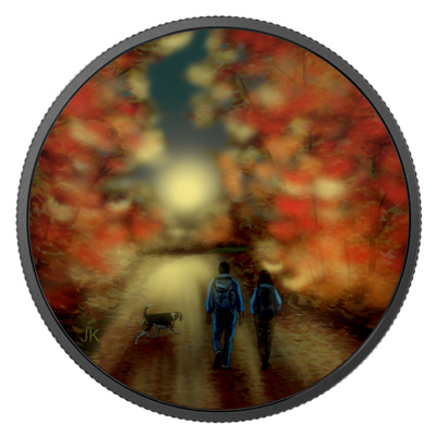 In den frühen Morgenstunden genießen Wanderer die Einsamkeit und die Ruhe der Natur, die nur durch den gelegentlichen Ruf eines Vogels unterbrochen wird. Das Motiv der Silbermünze zeigt ein Paar unterwegs durch den morgendlichen Herbstwald. Der Betrachter sieht die beiden von hinten, wie sie einen breiten Waldweg entlang wandern. Sie werden von ihrem Hund begleitet. Zwischen den Zweigen mit ihren rot, orange und goldgelb gefärbten Blättern geht gerade die Sonne auf. Noch mehr Morgenstimmung bietet die Szene, wenn man sie im Dunkeln betrachtet. Dann scheint die Sonne gerade erst ihre ersten Strahlen über den Horizont zu schicken.