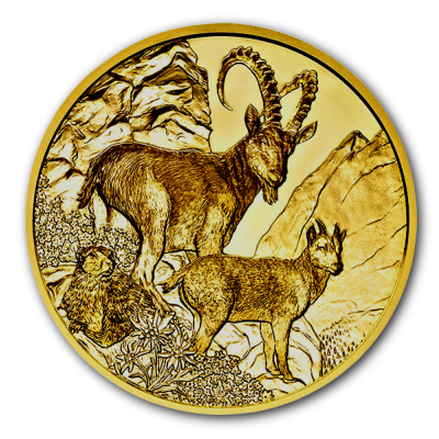 Die Rückseite zeigt einen Steinbock und ein Jungtier in ihrem natürlichen Lebensraum – dem Hochgebirge. Steinböcke steigen bis auf über 3500 Meter auf und sind ausgezeichnete Kletterer. Die beiden Tiere auf dem Münzmotiv stehen in einer steilen Felswand. Auf dem schmalen Absatz ist gerade noch Platz für ein Edelweiß und ein kleines Murmeltier im Vordergrund. Die Goldmünze hat einen Durchmesser von 30 Millimetern und ein Feingewicht von 16 Gramm. Der Feingehalt liegt bei diesen Sammlerstücken bei 986/1000. Der Münzrand ist glatt. Die Münzen gelten als gesetzliches Zahlungsmittel in Österreich. Sie werden mit Umverpackung und nummeriertem Echtheitszertifikat ausgegeben.