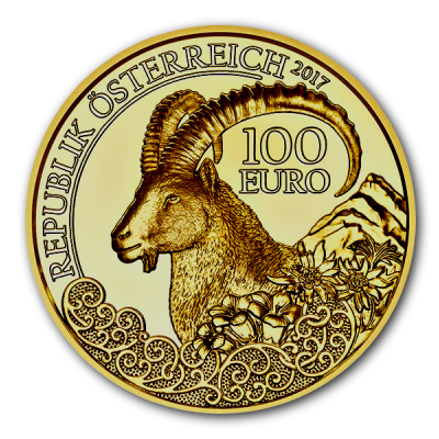 Stolz präsentiert sich der Steinbock auf der Wertseite der Goldmünze. Seine geschwungenen Hörner umrahmen den Nennwert von 100 Euro, sein Blick geht zur Seite. Der kräftige Hals deutet den muskulösen Körper an. Steinböcke können ein Gewicht von mehr als 100 Kilogramm erreichen. Ihren eindrucksvollen Hörnern wurden früher magische Kräfte nachgesagt; außerdem waren sie eine äußerst beliebte Jagdtrophäe. Das führte dazu, dass der Steinbock in den Alpen schon im 19. Jahrhundert beinahe ausgerottet war. Nur in Italien überlebte eine kleine Population, von der alle ca. 45.000 heute lebenden Tiere abstammen. Neben dem Porträt des Steinbocks zeigt das Münzmotiv einen Berggipfel als Hinweis auf den Lebensraum der Tiere. Im Vordergrund sind außerdem Enzian und Edelweiß zu erkennen.