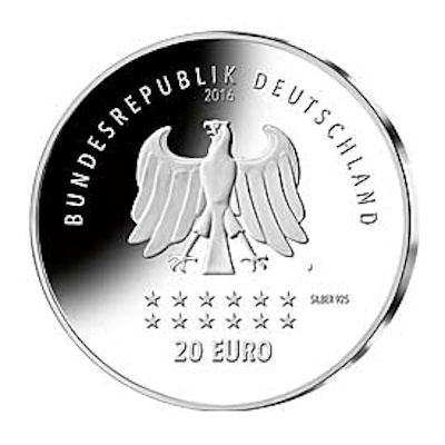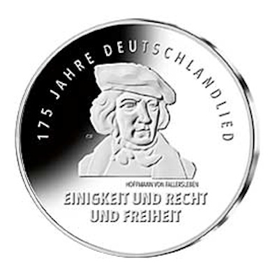 Die Einheit Deutschlands beschwor August Heinrich Hoffmann von Fallersleben, als er 1841 das „Lied der Deutschen“ dichtete. Heute ist den meisten nur noch die dritte und letzte Strophe vertraut – als Nationalhymne der Bundesrepublik Deutschland. Zum 175. Geburtstag des Liedes erschien 2016 eine 20-Euro-Gedenkmünze aus Sterlingsilber. Das Sammlerstück in Spiegelglanz-Qualität wurde in einer Auflage von 175.000 Stück geprägt.