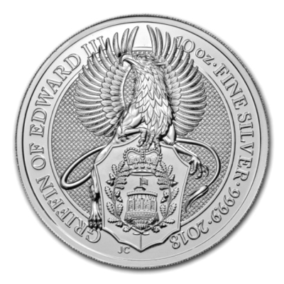 Ein Tier aus der Legende für einen legendären König: Unter den „Queen’s Beasts“, die bei der Krönung von Elizabeth II. den Eingang von Westminster Abbey bewachten, war auch der Greif König Edwards III. Die Royal Mint hat ihn für ihre Silbermünzen-Serie auf 10 oz Feinsilber gebannt. In der Serie sind bereits der englische Löwe, das schottische Einhorn und der Rote Drache von Wales erschienen.