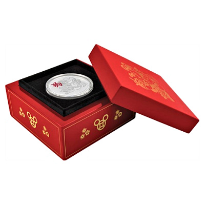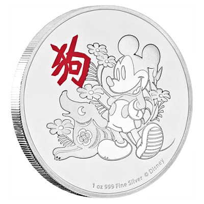 Das Motiv der Silbermünze zeigt einen fröhlich mit dem Fuß wippenden Micky. Neben ihm liegt ein stilisierter Hund auf dem Boden. Im Hintergrund sind einige Blumen zu sehen. Einen Farbakzent setzt das leuchtend rot kolorierte chinesische Schriftzeichen für „Hund“ in der oberen Hälfte. Rot gilt in China als Glücksfarbe, die beim Neujahrsfest auf keinen Fall fehlen darf. Auch das Etui und die Umverpackung sind deshalb ganz in rot gehalten. Die goldenen Verzierungen des Etuis zeigen das Münzmotiv auf dem Deckel und an den Seiten Blümchen sowie das Micky-Maus-Logo im „chinesischen“ Stil.