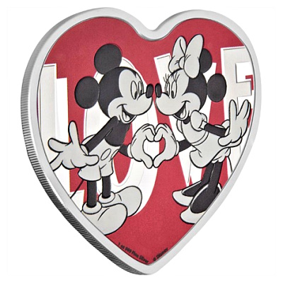 Lizensierte Disney-Sammlerstücke sind ein Spezialgebiet der New Zealand Mint. Seit Jahren schon läuft die Silbermünzen-Serie „Mickey Through the Ages„, auch „Die Eiskönigin„, die Disney-Prinzessinnen oder die Helden aus dem Film „Cars“ waren schon Thema der Sammlerstücke. Dazu kommen verschiedene Jubiläums-Ausgaben, zuletzt 80 Jahre Schneewittchen. Auch für Verliebte gab es schon drei Silbermünzen: Crazy in Love, True Love Forever und Love Crazy. Doch die neueste Ausgabe setzt noch eines drauf: Sie zeigt nicht nur Micky und Minni, die mit ihren Händen ein Herz formen, vor einem roten Hintergrund mit dem Wort „Love“ in großen Buchstaben – auch die Silbermünze selbst ist herzförmig.